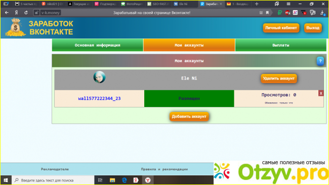 Ну, что же любопытство взяло верх. Я зарегистрировалась на нем, личный кабинет выглядит очень просто. Далее мне предлагалось прикрепить свою страницу вконтакте.