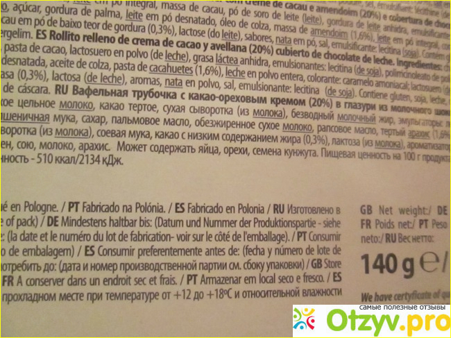 Сами вафельные палочки лежат внутри в пакетике из фольги, их 14 штук, то есть по 10 грамм каждая.