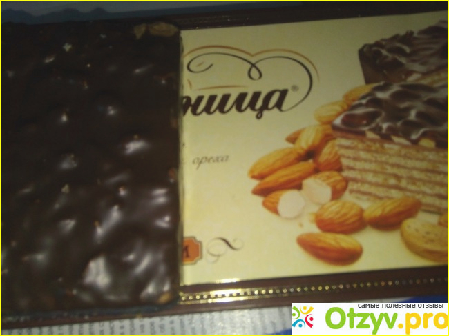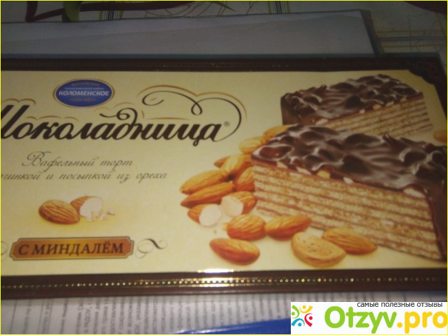 Сам по себе торт очень нежный, вафли в нем очень хрустящие, и даже, если торт постоит открытым пару дней, вафли все равно остаются хрустящими. Прослойка между вафлями очень сладкая, но не приторная, нежная, с ароматом орешков. Шоколадная глазурь тоже достойная. В меру сладкая, и чувствуется, что шоколад очень даже хорошего качества. Сам вафельный тортик покрыт не только глазурью, но и орешками. Очень порадовало, что даже сейчас, когда многие производители пытаются сэкономить на производстве, Коломенский явно орехов не пожалел. Их довольно много, и они очень даже вкусные и свежие.