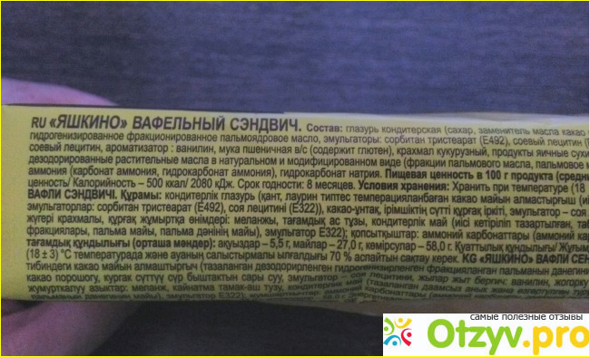 Состав на 4, не могу сказать, что он очень плохой, но наличие пальмового масла и е-шек всегда меня отталкивают от покупки продуктов их содержащих. Я не могу сказать, что вкус данных вафель от "Яшкино" мне понравился. Хотя, если кушать примерно половину одной с чаем, то они кажутся очень вкусными и сытными.