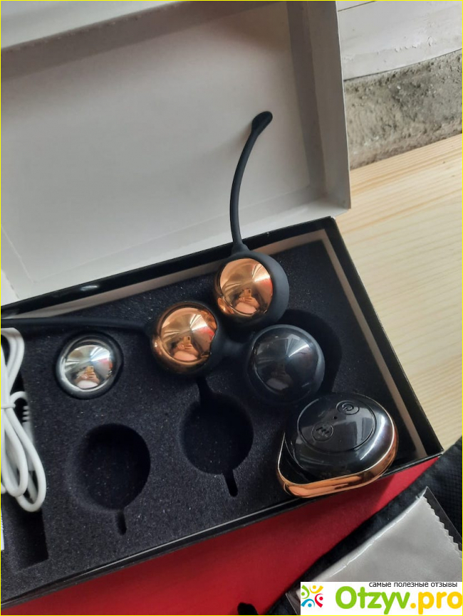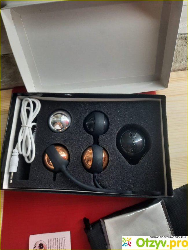 Приходят они в красивой упаковке, в комплекте идет четыре шарика разного веса (один из них с вибрацией), силиконовая нить(100% мед силикон), пульт, зарядка, мешочек для хранения и салфетка.