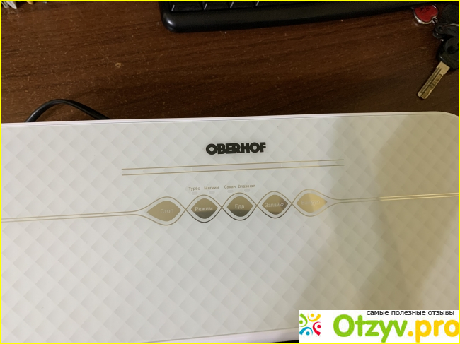 Автоматически запаивает, откачивает воздух. Больше всего привлекло, так это овощерезка, которая идёт в подарок. Она мега крутая, с её помощью можно измельчить совершенно любые овощи и фрукты. Сам вакууматор откачивает воздух и запаивает пакеты. Очень быстро, легко и удобно. По размеру он не большой, поэтому много места не занимает. Спасибо оберхоф за такого помощника!