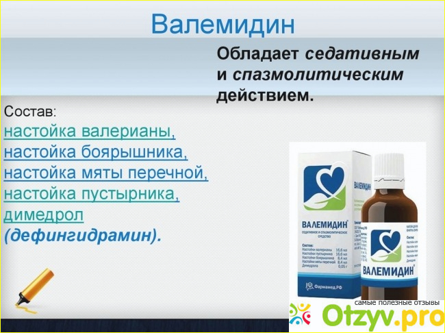 Выпускается он в форме капель, состав имеет полностью натуральный, а именно растительный, главных компонентов несколько, поэтому его можно назвать смело комбинированным. Преимуществом Валемидина выступает тот факт, что никакого негативного влияния на организм он не принесёт.