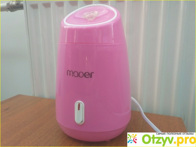 Сам вапоризатор выглядит очень миленько. Розовый, а отверстие для пара в форме розочки. Кнопка включения с подсветкой, чтобы было сразу видно, что вода греться начала. Единственный минус – вилка не под наши розетки, но это легко решается переходником.