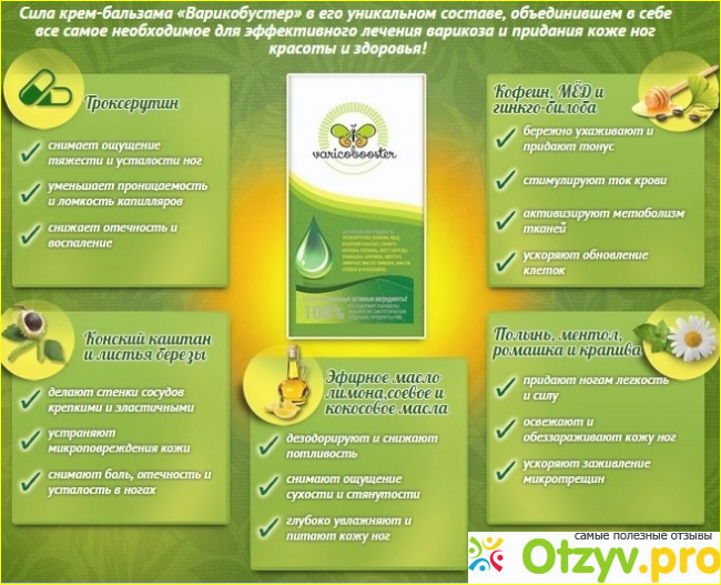 Варикобустер тонизирует венозную стенку, его компоненты устраняют застои крови.