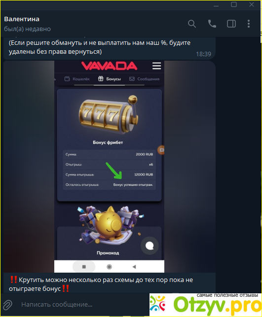 Меня направили на закрытый бот канал, там были красивые скрины больших зарплат, что только подогрело мои подозрения. Есть вип чат, но туда можно попасть только после первого вывода. Всего в чате было 4 игры. Стартовый капитал был взять с промокода, который я ввела в разделе Бонусы. С бота я перепрыгнула на сайт Vavadabns, владелец которого предпочел скрыть информацию о сайте. Среди множества игр нужно было выбрать указанные четыре и играть ежедневно в них якобы тестируя. На деле в отчетах нужно было указывать выигранные суммы.