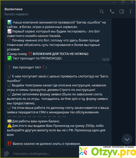 Предложила подработку-тестировщик казино автоматов. Условия были интригующие: нужно было 20% отдавать куратору. Зарплату обещали до 55000 в месяц, оплата идет за каждую игру 800-1500. Я согласилась участвовать в этом фарсе, чтобы написать отзыв о новом для меня виде мошенничества. По условиям я должна тестировать по 3 игры в день.