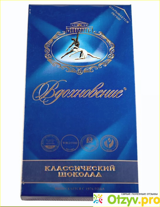 Коробочка шоколада “Вдохновение” оформлена в узнаваемом стиле данного производителя. Фирменный логотип с Большим театром и танцующей парой – узнаваемая символика данного шоколада. Вся линейка шоколада “Вдохновение” отличается только надписями, будь то орех или какая-либо начинка. Заслуженные награды на различных конкурсах, помещенные на лицевую часть упаковки, подтверждают высокое качество продукта.