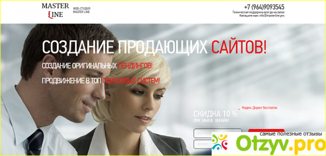 Симпатичный, привлекательный сайт веб-студии "Master Line", впечатляет! Подобраны фотографии, отвечающие тематики сайта. Заходишь на сайт и сразу понятно о чем сайт, в первом блоке прописаны основные предложения веб-студии, крупными заголовками и тут же скидки и бесплатное предложение по Яндекс. Директ.