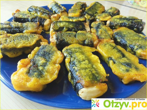 В миске разводится нутовая мука, вода и немного соевого соуса для соли, так чтобы получился жидкий кляр, без комочков. В него погружаются все заготовки, непосредственно перед обжариванием. На сковороде разогревается растительное масло, и один за другим выкладываются сыр в нори. Как только кляр схватится и приобретет красивый, золотистый цвет, можно переворачивать на другую сторону. После обжарки, блюдо нужно извлечь из масла, чтобы не было слишком много жира. Можно есть как самостоятельно, так и с салатом, рисом, гречкой, картофелем по вашему желанию. Это действительно невероятно вкусно.