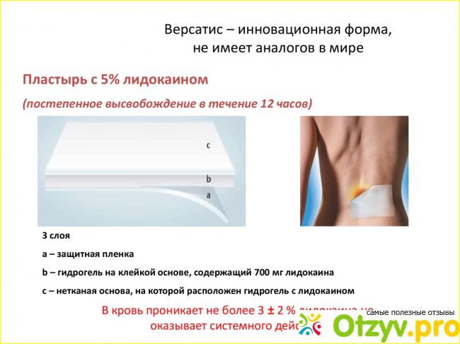 Пластырь с лидокаином Версатис — действует местно, начинает работать сразу же, как только соприкасается с кожей. Его активные компоненты проникают благодаря порам под кожу и начинают свое обезболивающее действие.