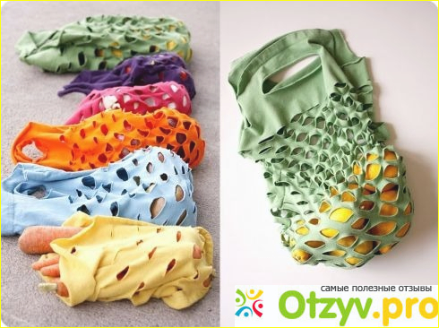 Из прочной футболки получится прекрасная авоська для продуктов. ЕЕ можно связать из футболочных полос, а можно просто вырезать форму сумки из футболки, зашить дно, обработать ручки и получится прекрасная экологическая сумка, которая заменит множество полиэтиленовых пакетов.