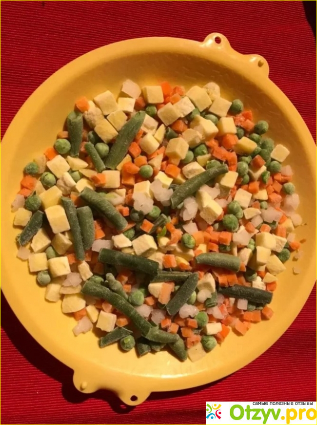 Я высыпала овощи из упаковки с красочным белым мишкой, и мне тут же захотелось их приготовить. Несмотря на заморозку, кусочки продуктов имеют яркий, насыщенный цвет, аккуратную нарезку и привлекательные формы. На них присутствует небольшое количество снега, и полностью отсутствует лед. Это значит, что их не замораживали повторно.