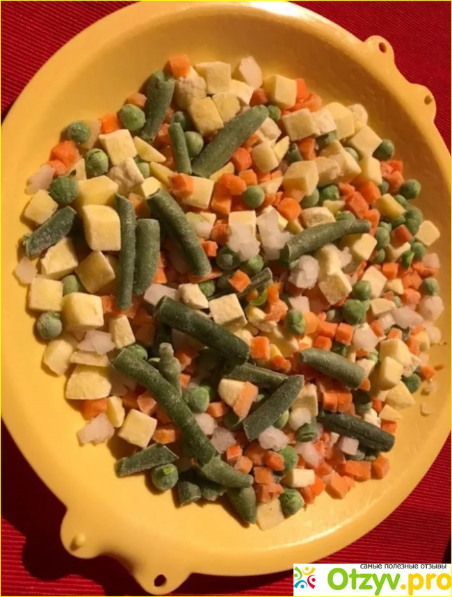 Внутри находятся замороженные овощи, по составу, который указывался на упаковке. Картофель и морковь, нарезанные маленькими кубиками, а стручковая фасоль небольшими кусочками. Даже зеленые горошинки были примерно одного размера, без мятых и сморщенных пятен. Пропорции количества каждого ингредиента в этой смеси сочетаются удивительным образом. Нельзя сказать, что чего-то здесь слишком много, а чего-то совсем мало.