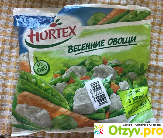 Пакет в целостной упаковке 400г. Есть описание способов готовки и состав. Так же, на пакете дан интересный рецепт приготовления данных овощей с курицей.