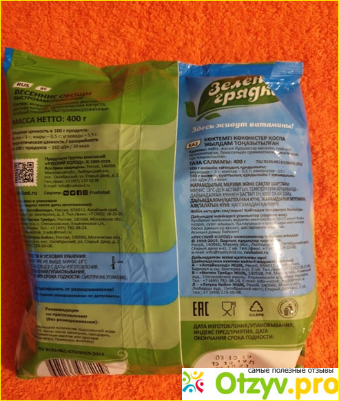 С обратной стороны нашелся состав, где было указано, что внутри находятся: морковь, спаржевая фасоль, 2 вида капусты (брюссельская и цветная), а также зеленый горошек. По составу у меня вопросов тоже не появилось, вроде все овощи сочетаются друг с другом.