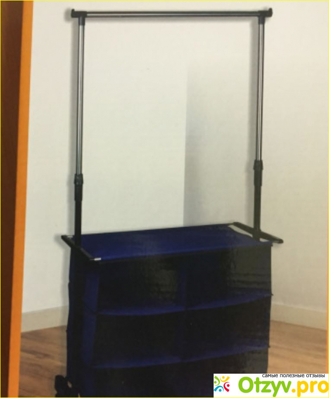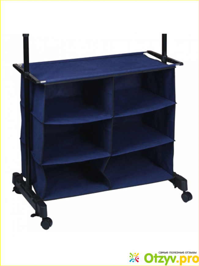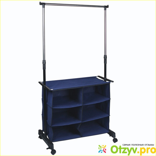В конструкции представлены органайзеры на шесть ячеек. В них можно хранить обувь и различные вещи, которые не требуют того, чтобы вешать на вешалки. Также есть и штанга, где размещаются вешалки. По бокам предусмотрены крючки, куда можно повесить сумку, головной убор или друге аксессуары, которыми вы часто пользуетесь. Изготовлен органайзер из достаточно плотного и прочного материала.