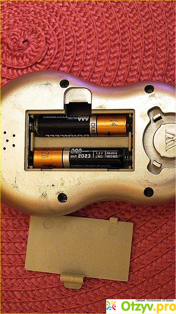Как я уже сказал, что эти весы электронные, поэтому у них должен быть источник питания, которым являются две мизинчиковых батарейки типа ААА. Они располагаются в специальном отсеке с крышкой на задней стороне корпуса. Заряда батареек хватает на долгое время и при необходимости они очень легко меняются.
