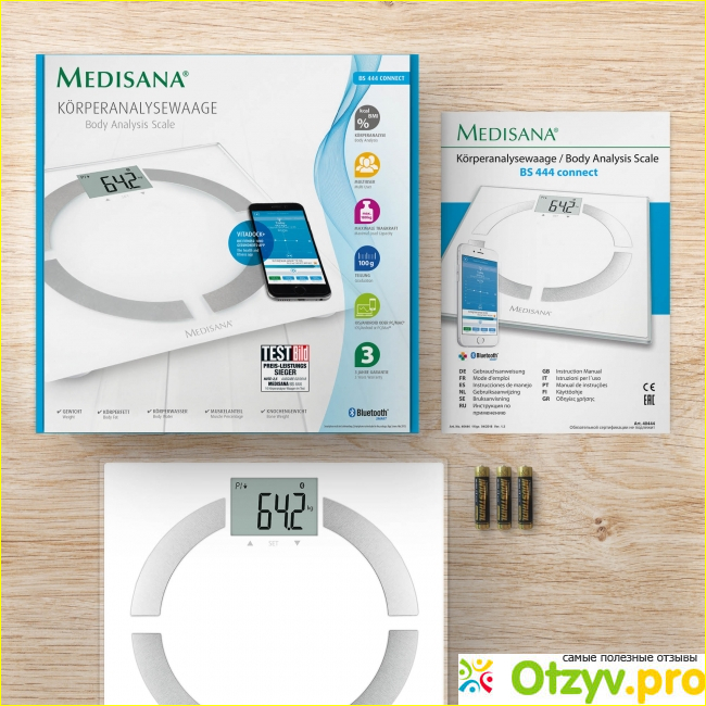 Весы Medisana BS 444 Connect предлагают современную функцию композиции тела. Прибор измеряет вес, а также жировые отложения, воду в организме, мышечную массу и массу костей, рассчитывает значение ИМТ и имеет комплексный анализ потребности в калориях. Соединение BS 444 не подходит для людей с кардиостимуляторами или другими медицинскими имплантатами. Передача данных через Bluetooth в приложение VitaDock +С помощью бесплатного приложения VitaDock + для iOS и Android вы можете сохранять все результаты измерений централизованно на своем смартфоне и просматривать их в любое время и в любом месте в виде четкой графики. Через VitaDock Online сохраненные данные также можно легко синхронизировать с приложением VitaDock + на других смартфонах или планшетах.
