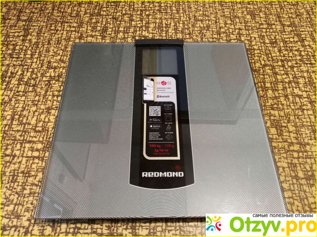 Упаковка – это картонная коробка, на которой отображается логотип производителя Редмонд. На лицевой стороне размещено изображении весов и девушки с гантелями. На оборотной стороне есть информация рекламного характера, которая знакомит покупателя с другими устройствами. Здесь же перечень технических характеристик весов.