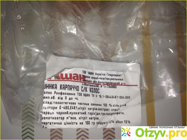 В принципе я покупками всегда довольна, что не могу сказать о купленной пару дней назад ветчине Карпаччо ТМ Колос. Я так поняла, что фасуют ветчину непосредственно в ТЦ Ашан.