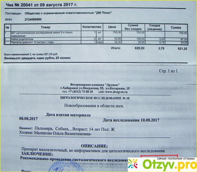 В августе 2017 года в ветеринарной клинике "Дружок" мы сдавали образцы тканей для цитологического исследования. Одно исследование показало наличие злокачественной опухоли, но наблюдавший нас врач по неизвестной причине эту информацию проигнорировал и выписал нас как выздоравливающих. За четыре месяца наблюдения, прошедших с момента операции он так и не разглядел, что у нашей собаки формируется повторный воспалительный процесс.