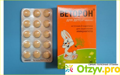 Мой ребенок принимал веторон в виде таблеток. Очень удобно, по одной таблеточке каждый день во время еды. И делал он это с удовольствием. А веселая упаковка с зайчиком, держащим морковку, вообще повышает настроение ему!
