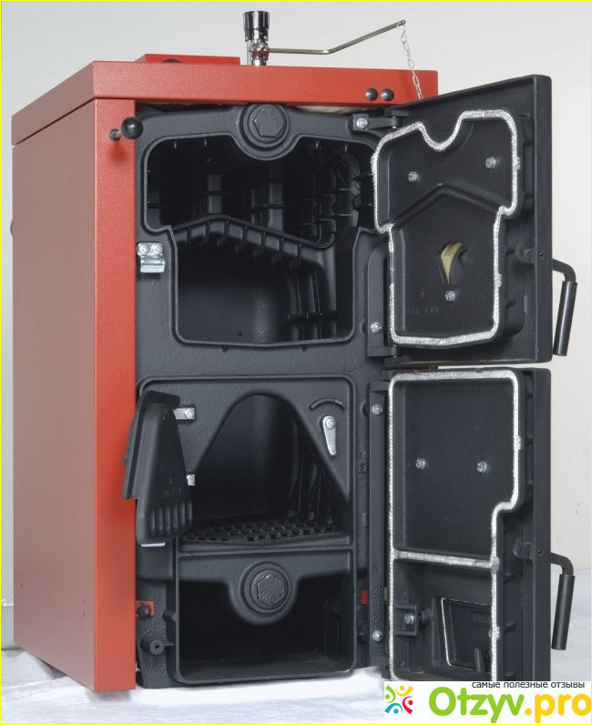 Довольно удобно строение зольника. При открывании дверцы поддува вытаскивается специализированный ящичек, в котором размещается вся отработанная зола, - ее просто надо вытряхнуть и ящик установить на прежнее место. Нормально также сделали и систему поддува – топка снабжена хорошими прорезями для воздуха, они не способны забиваться золой и другими продуктами сгорания топлива, в зольник не попадают щепа и другие материалы. При установке на шкале, к примеру 50оС котел будет выдавать такие же 50оС, с небольшой погрешностью примерно в два – три градуса, что не может быть особо принципиально. Совместно с температурным датчиком нормально функционирует также заслонка. В частности, выставили ту температуру, которая необходима, происходит прикрытие поддува таким образом, что температура никак не поднимется выше тех значений, которые были заданы изначально. А следовательно, не надо подбрасывать дрова. Все четка как в аптеке.