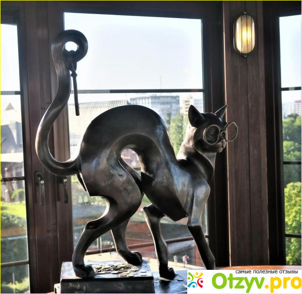 А бронзовый кот в пенсне не только украшает, но и охраняет башню!