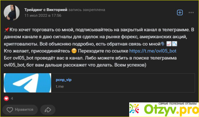 Таким образом, обучение трейдингу у Виктории Осипчук может быть полезным и эффективным для начинающих трейдеров, НО это не гарантирует успешную торговлю. Оценка курса трейдинга должна основываться на научных данных и практических результатов учеников. Если вы вдруг-то решились обратиться именно к ней – прежде всего советую проконсультироваться со знающим людьми, чтобы не оказаться у разбитого корыта. Возможно, Виктория Осипчук и разбирается в трейдинге. Возможно, даже торгует в плюс. Но ни одного доказательства тому нет. За что отдают деньги люди в платном телеграм-канале – непонятно. И в таких условиях я не могу рекомендовать сотрудничество с подобным «экспертом».
