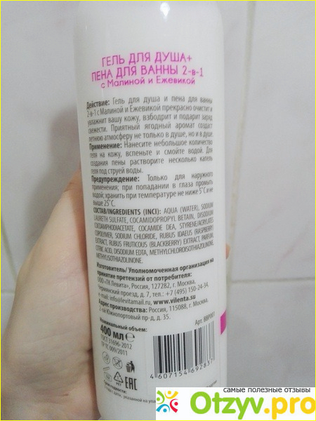 Мне понравилось, что средство имеет приятный запах, пахнет то ли малиной, то ли ежевикой, как и заявлено в описании. Как бутылочка вполне приятная для глаз, не маленькая, расход получается более или менее экономный. Объем 400 мл. У меня уже долгое время она стоит в ванной на полочке.