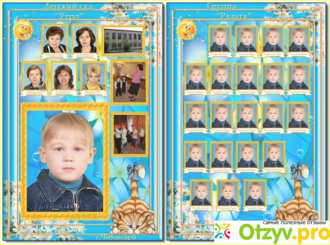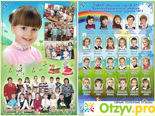 Нам предложил фотограф стандартную виньетку, на которой на первой странице большой портрет ребенка, следующая страница - воспитатели и персонал детского садика, затем несколько разворотов портретов деток садика, и далее два разворота коллажи из общих фотографий с утренников, прогулок или игр в группе. Но мы еще попросили вставить дополнительный лист в каждую виньетку, чтобы на этом листе было максимально возможное количество фотографий конкретно с ребенком, чья это виньетка. Стоимость разницей получается в один доллар, но зато фотографий будет намного больше.