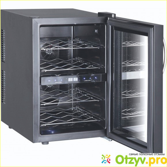 Шкаф имеет деревянные полочки. Но вот отдельно, чему надо уделить внимание в этом вином шкафу, так это сам принцип охлаждения. Дело в том, что компресоров в нем нет, от чего понятно, что вибрация здесь просто исключается.