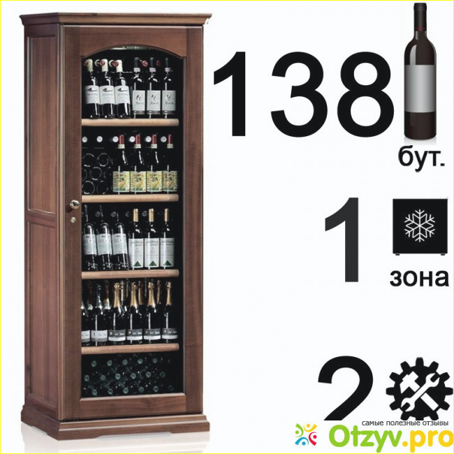 Он достаточно вместительный, можно в нем хранить около 138 бутылок, а это скажем так не мало, именно то количество, которое мне в принципе и нужно. Выполнен в классическом стиле, он идеально вписывается в любой интерьер. Сам корпус металлический, с деревянной обделкой, что бы не попадал свет, стекло оснащено уф защитой и фильтрами, что позволяет вам видеть бутылки, но тем не менее, не пропускает свет, что категорически запрещено, при правильном хранении вина. Процессор в этом шкафу настроен не только на охлаждение и поддержание нужно температуры, а и на обеспечение оптимального уровня влажности, что тоже является ключевым в хранении вина. Предназначен изначально для того , что бы стоять самостоятельно. В общем, меня устроил , как внешний ид, так технические характеристики , так и цена. Уже год как мы пользуемся этим так называемым погребом и что я вам хочу сказать, я довольна полностью, мало того что он заменяет настоящий винный погреб и сохраняет первозданный вкус вина, так еще и шикарно дополняет интерьер, сейчас это изюминка нашего ресторана.
