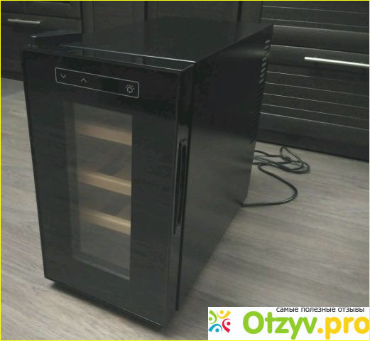 переживал, что в реальной жизни он окажется не таким, как на фото. Но, слава богу, он был точно таким же. Отмечу наличие дисплея и удобное панели управления. Температура регулируется с точностью до градуса и текущая всегда видна на панельке.Понравилась стеклянная дверца, через которую видно содержимое шкафа. Вечером еще можно включить подсветку, и если сидеть при свечах, получается очень антуражненько. Бутылки внутри размещаются на специальных деревянный полочках. Я уже после вычитал, что они гораздо лучше металлических, так как лучше гасят вибрации, которые могут как-то повлиять на вкус вина.