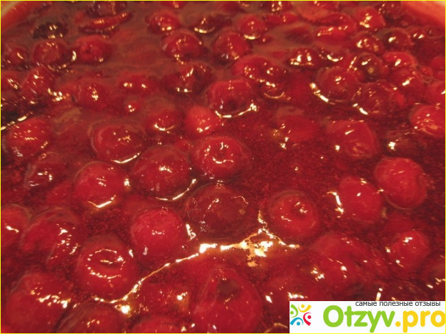После того, как справились с ягодой, оставим ее ненадолго и приступим к приготовлению сладкого сиропа, в котором после будем готовить вишню. Заготовленную заранее воду в необходимом для нас количестве выливаем в кастрюлю и доводим до кипения. После всыпаем фруктозу и размешиваем до тех пор, пока она не растворится. Готовым сиропом заливаем наши ягоды и помещаем на маленький огонь, на котором варим минут 7-10, не больше, иначе фруктоза потеряет все свои полезные свойства. Не забываем аккуратно помешивать варенье, чтобы оно не пригорело, что часто случается, несмотря на короткие временные рамки для приготовления. Замечу, что из-за фруктозы вишня становится немного бледнее, но это никак не влияет на ее вкус и хранение, чтобы не пугались.