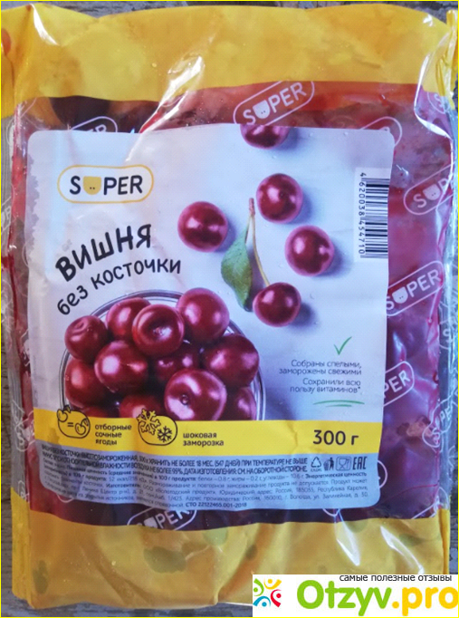 Вишня без косточки Super оказалась совершенно не супер, но об этом позже. На упаковке написано, что заморозка шоковая. При ней, кстати не нарушается структура ягод и сохраняются все витамины, как в свежих. Указано на пачке и то, что ягоды отборные, свежие и сочные.