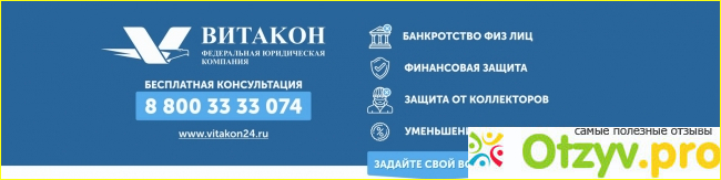 Если вы не знаете, как защититься от надоедливых коллекторов, если вы банкрот или вы хотите уменьшить платеж по кредиту или у вас есть другая острая проблема , которая мешает вам жить, просто обратитесь за помощью. Уже многие люди обращались за помощью в компанию и готовы поделиться своим мнением насчет работы Витакона и эффективности.