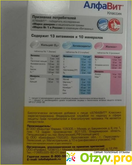 Что касается комплекса "Алфавит"... Я осталась довольна препаратом. Принимала витамины и получше, но и стоили они в несколько раз дороже. Так что цену свою "Алфавит" оправдывает вполне.