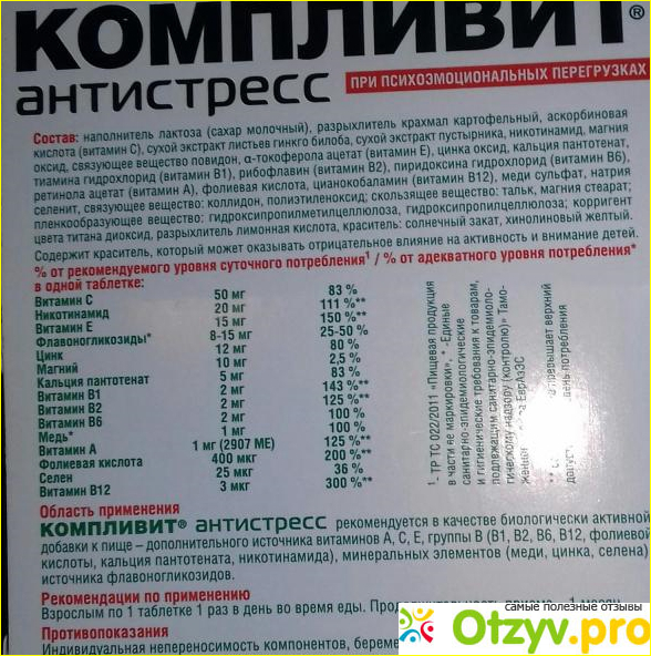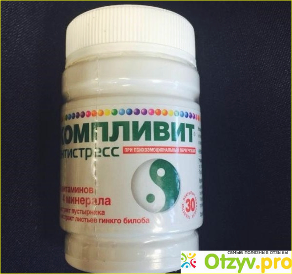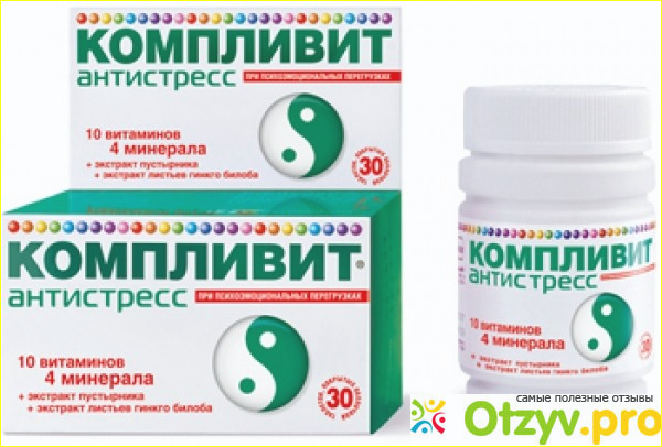 Я сначала хотела купить обычный комплекс со стандартным набором витаминчиков, но тут мне на глаза попались витамины "Компливит Антистресс". По названию я поняла, это я и искала. Набор витамин, указанных на упаковке достаточно скудный, но в основном он рассчитан на стрессовые состояния, потому в составе магний и ему подобный комплекс. Это действительно действует на организм успокаивающе, так как я отдельно покупала магний в ампулах и пустырник и действие мне понравилось.