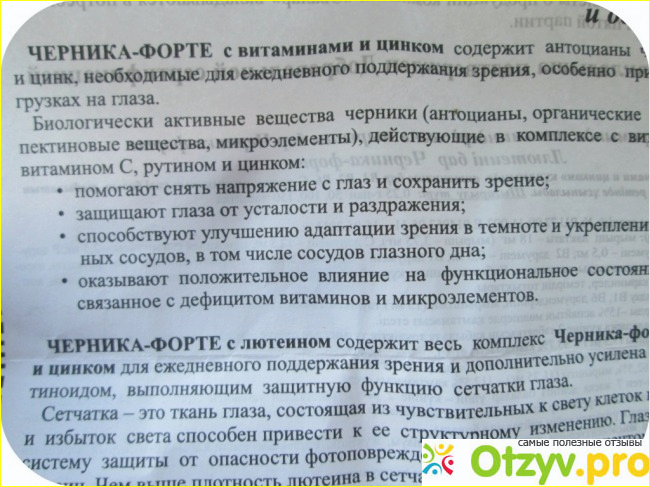 Витаминный препарат с черникой, были в виде таблеток. Муж принимал эти таблетки больше месяца. Где-то недель шесть или семь. Для большего эффекта. Конечно, лучше кушать саму чернику в натуральном виде, или хотя бы в сушенном. Также очень хорошо пить сок из черники. Но, это не особо и доступно. А вот витамины, в каждой аптеке без проблем можно приобрести. Пропив эти витамины, муж заметно ощутил улучшения зрения. Он пошел к доктору. Окулист также подтвердил, что зрение стало лучше. Вообще у кого зрение, слабое, то такие витамины, следует периодически пить. Помогая своим глазкам, питая их необходимыми витаминами. У моей мамы с годами, зрение тоже несколько стало слабее. Я посоветовала, ей эти витамины с черникой. Она осталась довольна результатом. Конечно же, следует каждому стараться меньше перегружать свои глаза. И самому в целом побольше отдыхать, особенно от компьютеров и телевизора. Наши глазки, только рады этому будут. Также необходимо правильно питаться, ведь от того, что мы ежедневно потребляем зависит не только здоровье наших глаз, но и здоровье нашего организма в целом. А витамины на основе черники это пожалуй лучший выбор, из всех, которые мы пробовали.