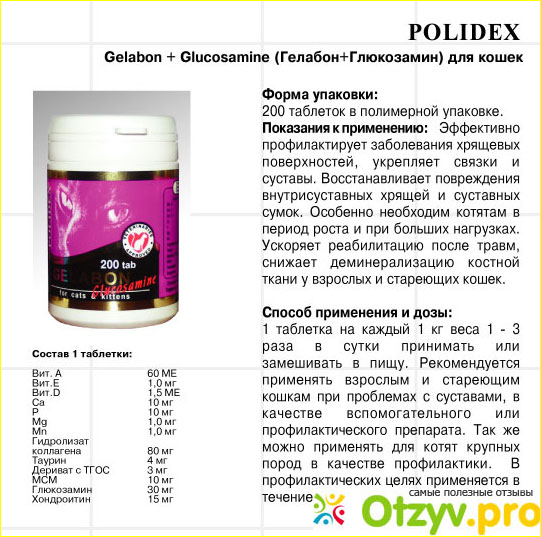 Я прочла статью о том, что у кошек с возрастом, как и у людей начинают болеть суставы. И с этим нужно бороться, так как со временем болевые ощущения будут только усиливаться. Так я стала искать качественные витамины для суставов, и к своему большому сожалению, поняла, что это не ходовой продукт в ветеринарных аптеках. Увы, люди покупают животным дешевку и не готовы потратить деньги на здоровье питомца, за которого несут ответственность. Тем не менее, в интернете сейчас можно купить все, и я нашла дорогие, но по отзывам весьма эффективные витамины Polidex Gelabon plus Glucozamine.