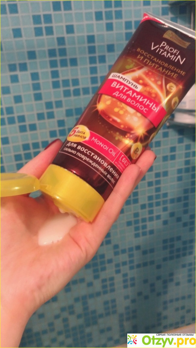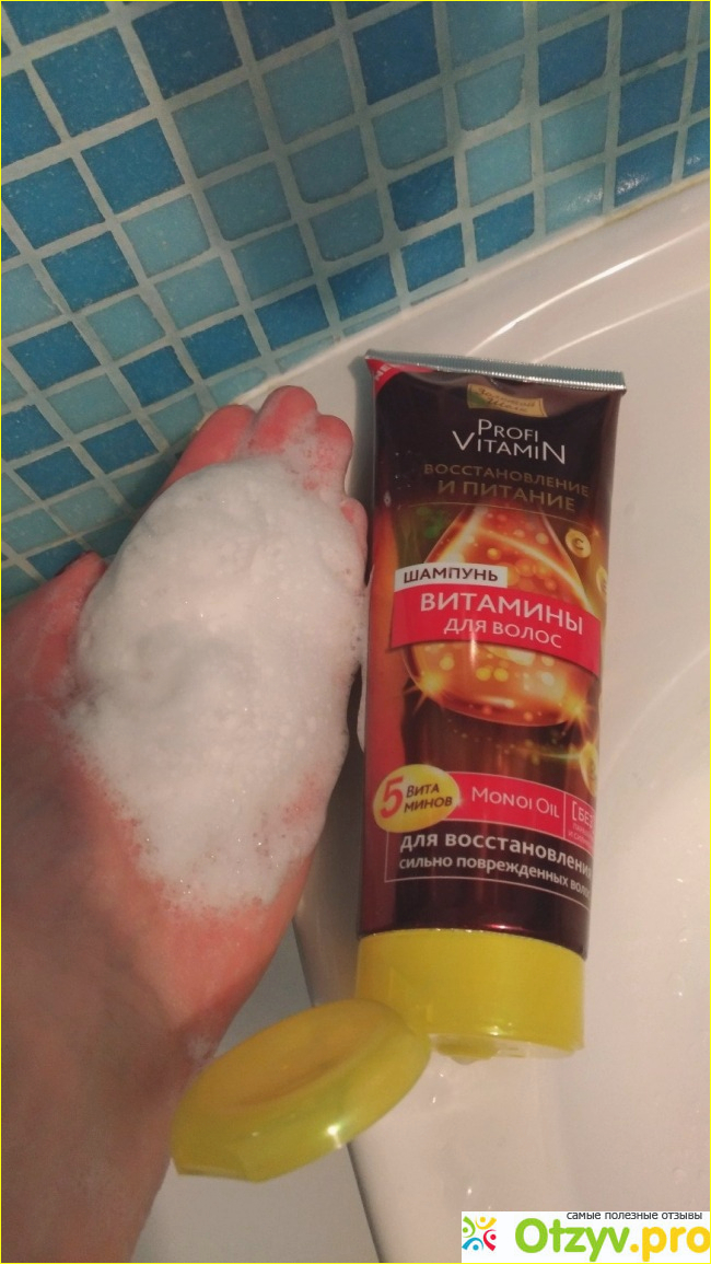 5 Витаминов Е, С, В3, В5, В6 + Monoi Oil, такого в других шампунях я еще не встречала, плюс цена невысокая, в районе 150 рублей, вот и решила попробовать (думаю не подойдет отдам мужу, ему всё подходит))