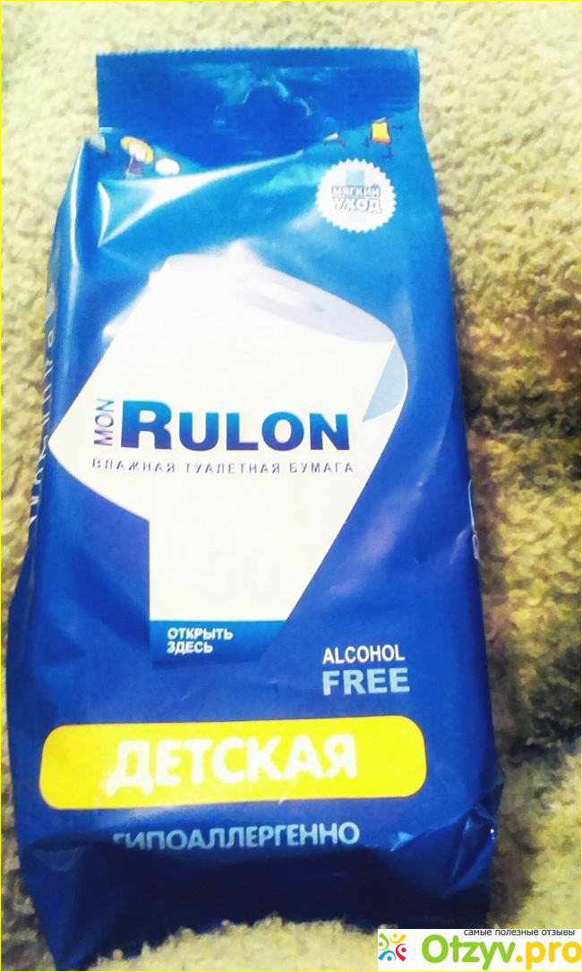 Итак представляю вашему вниманию влажную детскую туалетную бумагу " Mon Rulon" . Ярко синяя упаковка с изображением идущих маленьких человечков. Защитного клапана нет, это сразу минус. Количество листов бумаги- 50 штук.