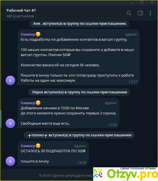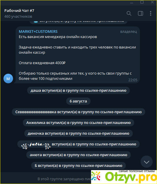 Проработала таким макаром всего две недели пока меня не кинули на оплату. Менеджер с наглым лицом отказался платить и еще пригрозил, что удалит меня из группы за кипишь. Еще раз такая ситуация повторилась через неделю с другим менеджером. Ежедневно в телеграмм группу Рабочий чат № 7 добавляют 20-50 человек, чтоб было кого обманывать на оплату.