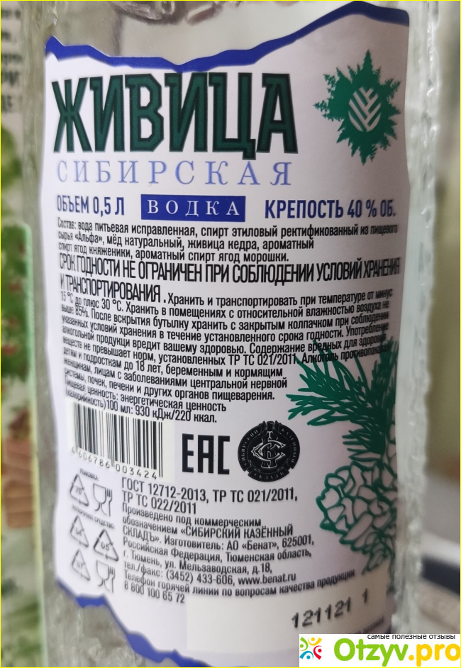 "Живица Сибирская" производится фирмой АО "Бенат" из города Тюмень. Она имеет красивую форму бутылки, которая, по-моему, должна повторять ствол хвойного дерева (кедра) и структуру его коры. Ёмкость бутылки стандартная - 0,5 литра, а крепость составляет 40%.