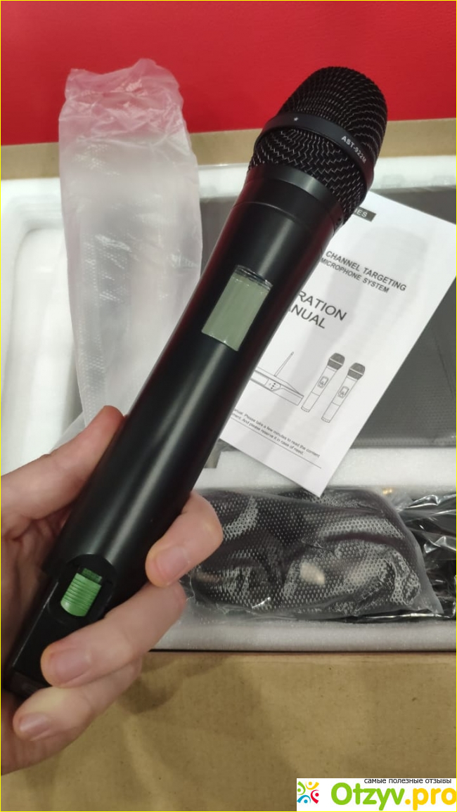 По своим тех. характеристикам вообще имеет радиус действия до 100 метров. Голос звучит отлично. С частотами все ок. Можно использовать и под низкие, и под более высокие тембры голоса. Микрофоны кардиоидой направленности. Не свистят, не заводятся, обратная связь вблизи колонок минимальная. Разбирал один из двух радиопередатчиков – капсюль стоит явно не дешевый. Имеющийся под куполом фильтр успешно сдерживает любые голосовые атаки и согласные типа «с», «ш» и так далее. Микрофонные корпуса из пластика, но посторонних шумов от сжатия их в руке не слышно. Дисплеи контроля установлены и на микрофонах, и на базе. Используем в составе АСТ-250 и напольная акустика JBL LSR6332. Купили тупо из-за заманчивой стоимости на вокальную радиобазу подобного уровня. Оказалось, что микрофоны идеальны не только в плане цены. Буквально недавно купил вторую такую же базу в подарок коллеге.