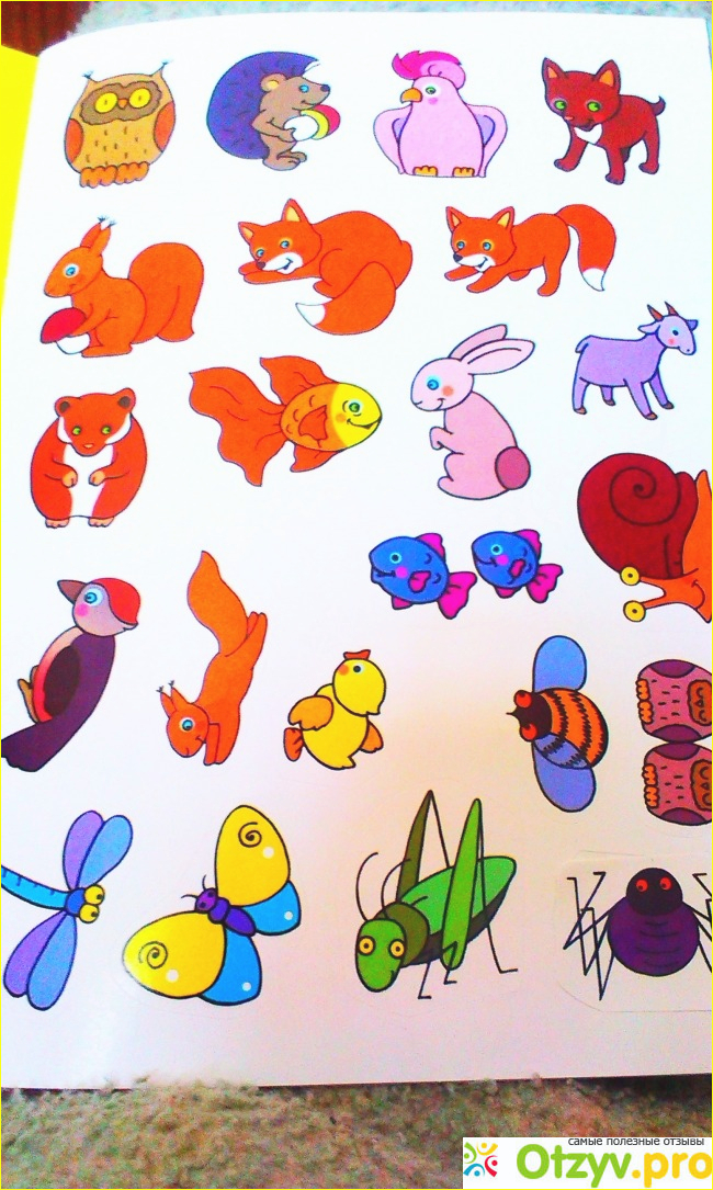 Тоненькая книжечка, имеет два листа с наклейками с изображением самых разнообразных животных . Плюс к этому есть страницы с иллюстрацией луга, леса, деревни, моря, дома.