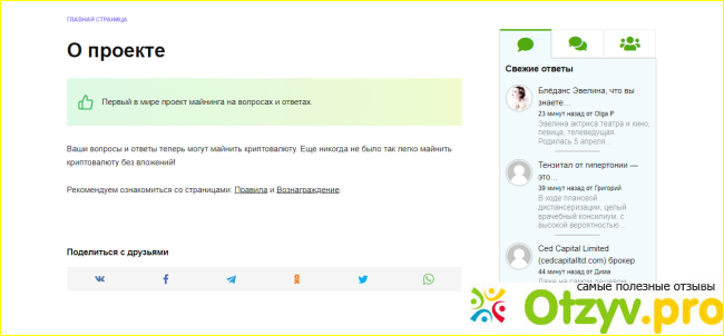 Но вопросы и отзывы - не основная фишка данного проекта, изюминкой его я считаю то, что тут платят не только в электронных деньгах, хотя я выводила только в них, но еще так же и в биткоинах. Описание сайта: "Майнинг на вопросах и ответах".