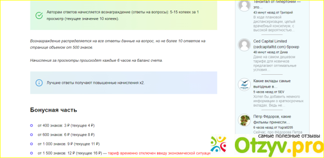 Итак, если вы пишете текст на четыреста знаков, то вам будет начислено четыре рубля. За шестьсот знаков вы получите восемь рублей, а за тысячу знаков, можете рассчитывать на одиннадцать рублей. Бонусы начисляются только на первые три ответа данные на странице вопроса.